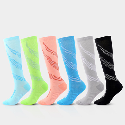 Nuevos calcetines de compresión de nailon a rayas coloridos para hombres y mujeres, Cuerpo de punto de altura para transfronterizos